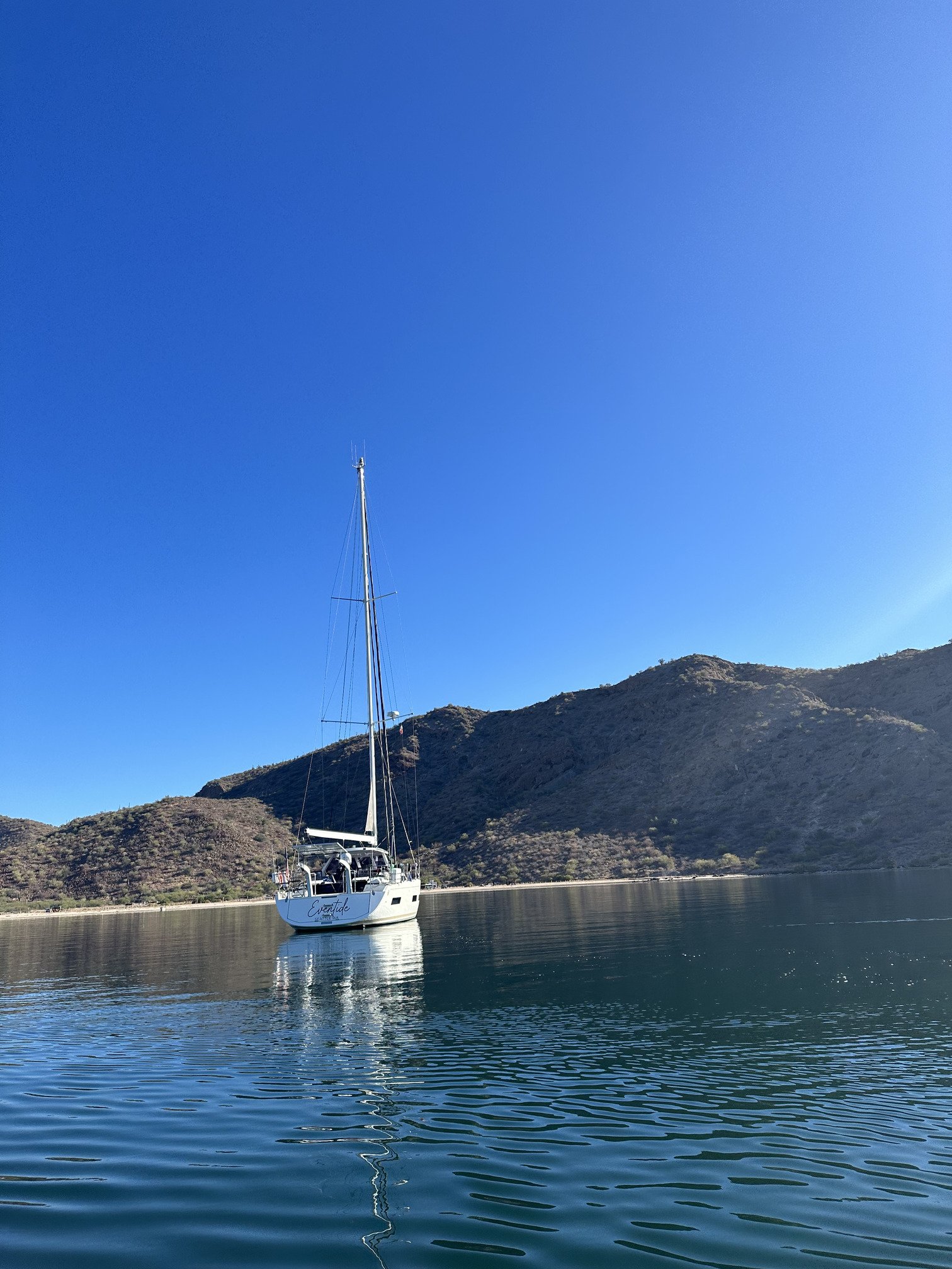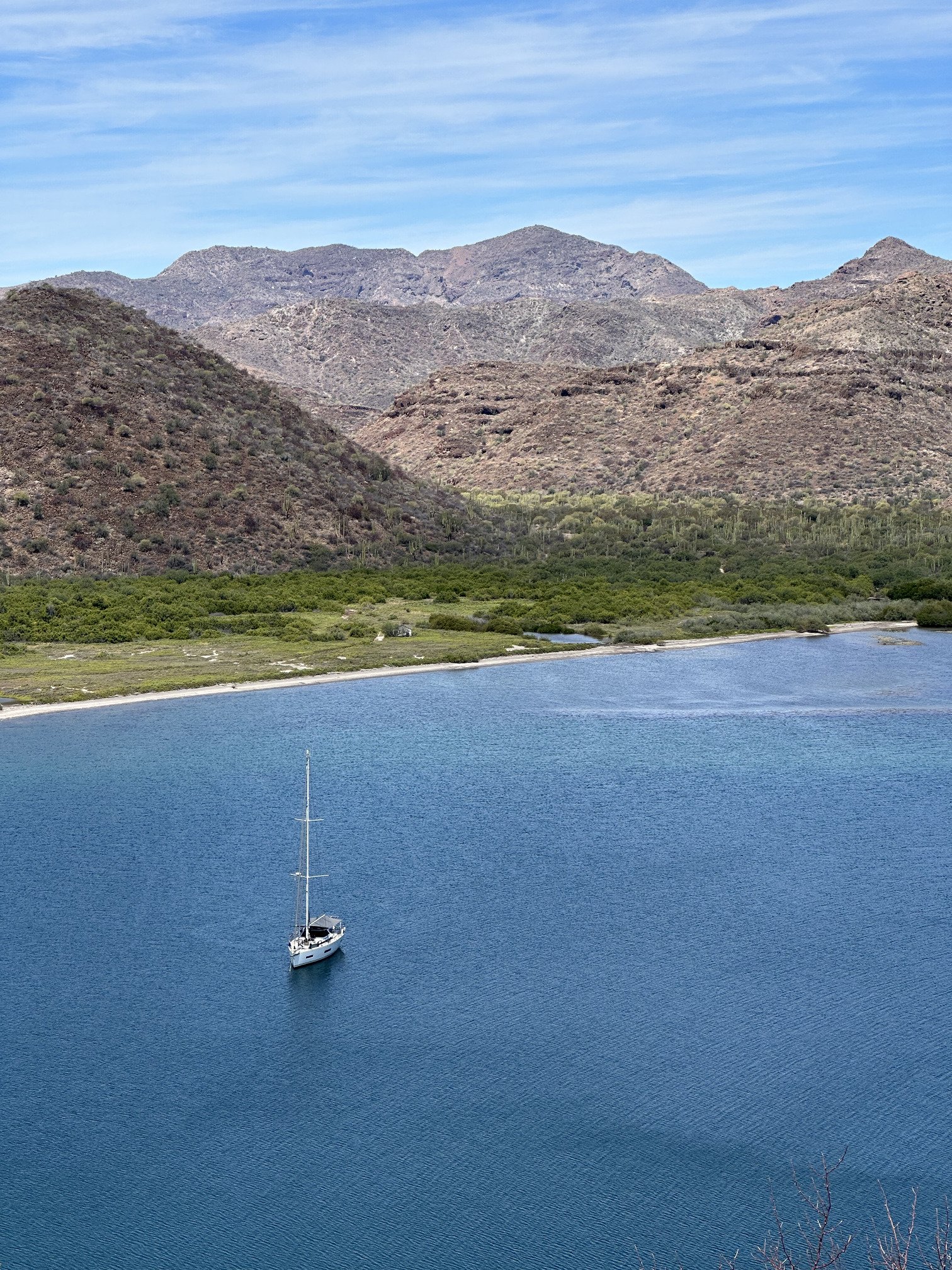 At the top of the bay lies a shallow anchorage set against the mountains that create the eastern side of the bay. We enjoyed our time here. Good wind protection from the afternoon easterlies and beautiful backdrops in all directions. The shore is undeveloped and the beach is full of cool shells. The water temperature here was 78 degrees in May, about 5 degrees cooler than further in the bay.