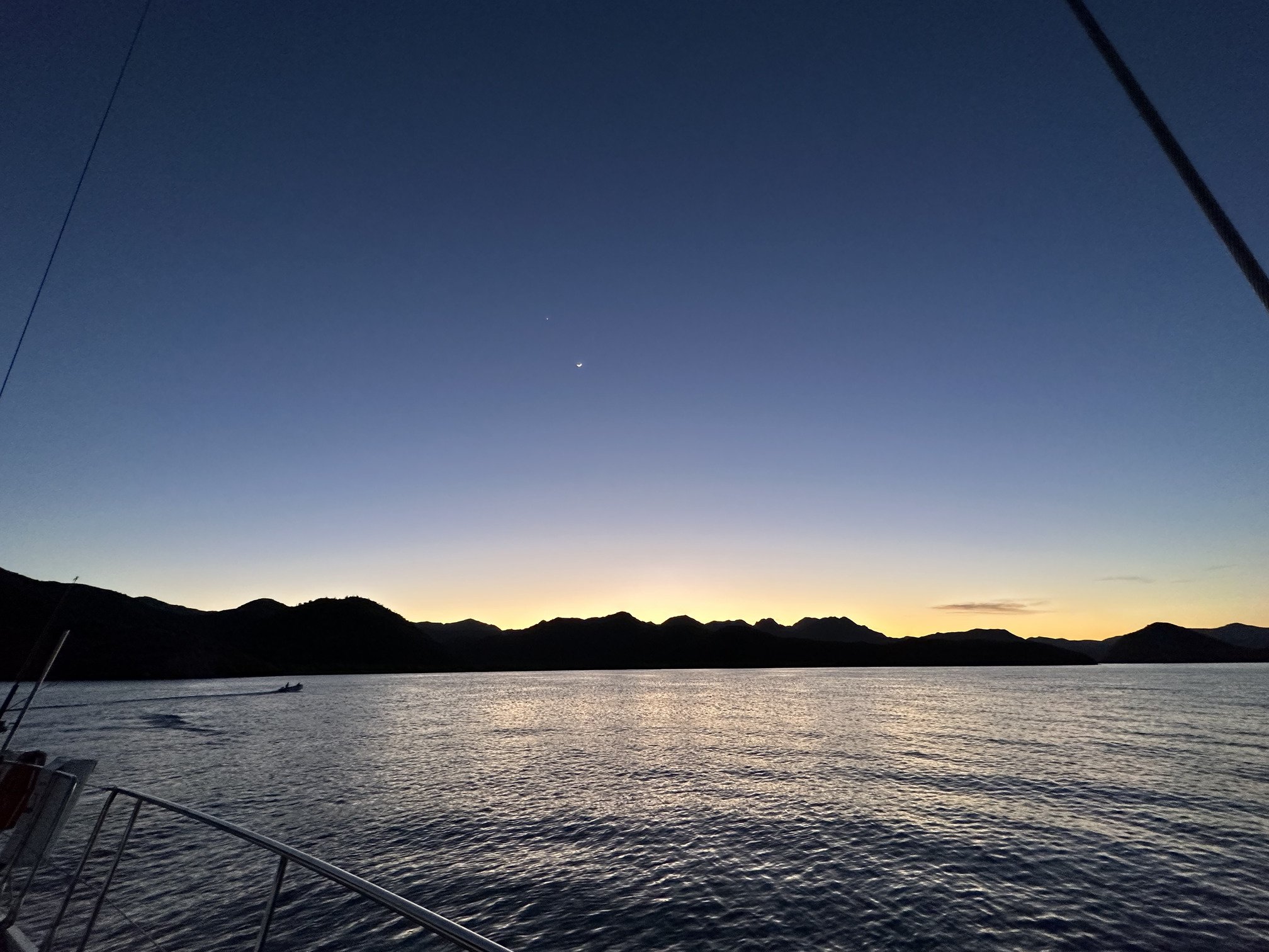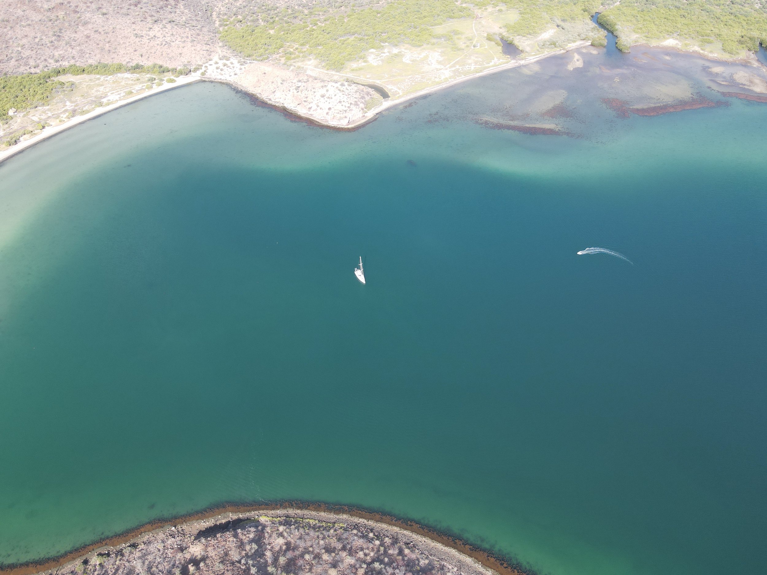 During our time here, there weren’t any big weather systems, so we mostly experienced the daily thermally created wind cycles. Hot sun and a dry landscape create breezes that cycle around the compass dial over the course of the day. The wind almost swirled around the bay, taking the air off the land, over the water, back onto the land, back over the water - all of which had the impact of heating the air. It felt like a blow dryer most days with winds in the teens in the afternoon with an air temp in the low 90s. It also created the odd experience of having the wind change direction within the bay - one day we sailed from a southern stop with the wind on our back until we were halfway up, and then the wind backed to being almost right on our nose with equal intensity. Early morning hours were typically calm with the wind filling in as the sun rose and heated the atmosphere.